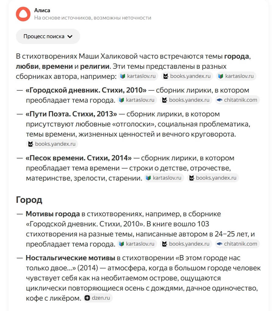 Всем привет. Вспоминала, из какого моего стихотворения всплывшие в голове строчки в предыдущем материале, имела удовольствие пообщаться с Алисой Al. Нейросеть Яндекса не только любезно напомнила название стихотворения (плюс год его написания) и название книги, в которую оно вошло, но и предложила узнать, какие ещё темы встречаются в моём творчестве. 😅 Ну что же, я не устояла и поинтересовалась. Оказывается, на основании анализа ряда источников, основные темы моего творчества - темы города, любви, времени и религии. Тема любви почему-то на втором месте. 😄 Тема любви в моих стихах допускает выделение таких подтем, как строки о мучительности затянувшегося чувства, строки об одиночестве и даже мотив "игры с перевоплощением". Также и в теме времени можно выделить ряд интересных образов и мотивов. Оказывается, у меня даже есть целый сборник религиозно-философской лирики. Совсем об этом забыла. "Полночный звон", кстати, был темой моей курсовой на пятом курсе обучения по творческой специальн