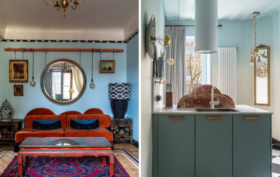 Коралловые акценты, от бра из винтажных тарелок на кухне до кофейного столика и разделительного лепестка столешницы кухни перекликаются с ручкой двери в коридоре. Голубой цвет, проявляясь в обоях, плитке, градиенте на стенах и дверях, объединяет ванную, коридор и кухню, создавая ощущение целостности пространства.