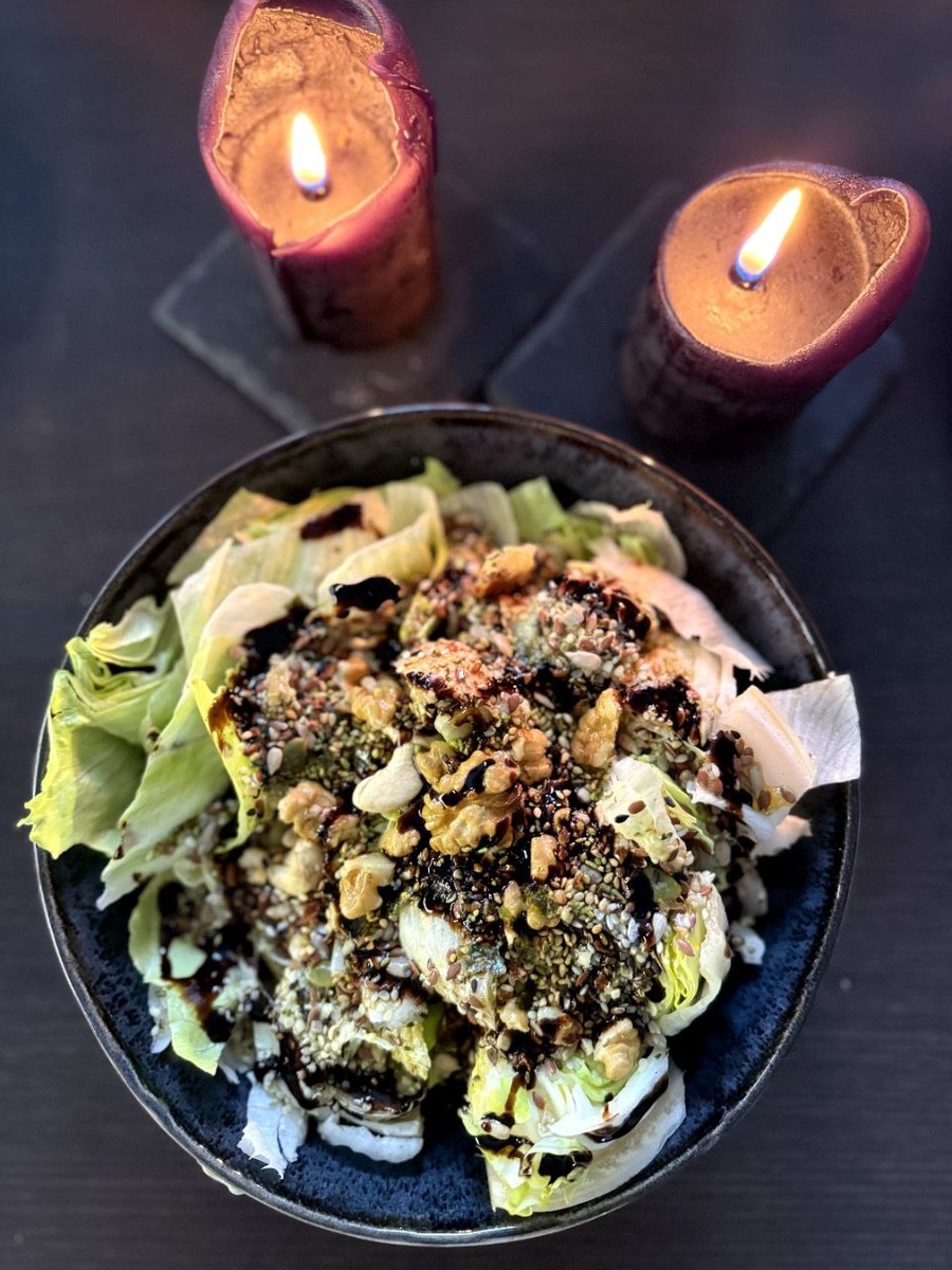 Если закончились огурцы, помидоры, вы забыли купить овощи, но дома есть тот самый салат айсберг... Мы знаем, как из него сделать настоящий салат. Он составляет основу и объём, но главенствуют детали, которые у нас есть всегда на кухне — и вам рекомендуем запастись. Это, конечно, смесь семян, без неё не обходится ни один салат. Дезактивированные дрожжи — с ними всё играет глубже и интереснее, даже простые салатные листья. Характерный акцент отдаём ореховому хрусту — кешью и грецкие сверху посыпаем. Соединяем маслами — тыквенным и оливковым, а если есть в запасах сушёная клюква, то вообще шикарно. Это так необходимая сладко-кислая вспышка радости. И этот салат не выглядит быстрым, но готовится за 2 минуты. Продуманный в запасах и спонтанный в сочетаниях, стильный, гениальный в простоте. Выручалочка перед внезапным визитом гостей или импульсом съесть чего-то свежее и хрустящее.