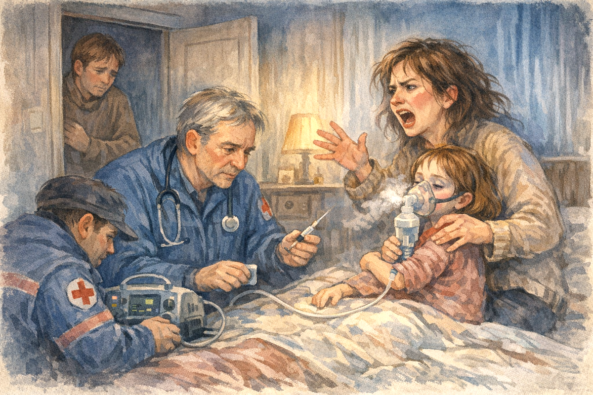 Среди холодной зимней ночи поступил новый вызов со странным поводом: мать не хочет лечить задыхающуюся дочь. Вызывал отец ребёнка. По прибытии бригада увидела на пороге квартиры робкого мужчину, который шёпотом просил их войти. В спальне находились двое: женщина лет сорока на вид с растрёпанной причёской и маленькая трёхлетняя девочка, которая уже сипела, хватая воздух ртом. Лицо её было бледным, губы синели на глазах. Мать сидела рядом, сжимала ребёнка в объятиях. Увидев медиков, она вскочила и попыталась препятствовать осмотру. Муж же почему-то жался к стене, не смея ей возразить. Доктор попытался объяснить опасность, но мать была непреклонна. Она неустанно кричала: «Никаких лекарств, у нас аллергия на всё! Мы только травами и заговорами лечимся». Ребёнку тем временем лучше не становилось. Врач попытался убедить отца дать разрешение на осмотр, ведь он точно такой же равноправный родитель, но и тут большой облом. К этому времени силы покинули ребёнка, она закатила глазки. Сознание мал