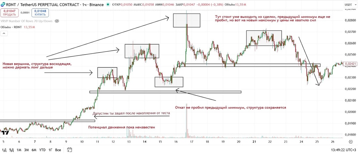 Когда эта структура ломается, рынок говорит тебе что твой сценарий больше не работает. Сидишь в лонге, цена перестала обновлять максимумы и пробила последний значимый минимум? Выходи немедленно. Не жди когда тебя вынесет по стопу, не надейся на возврат — структура сломана, значит быки потеряли контроль.