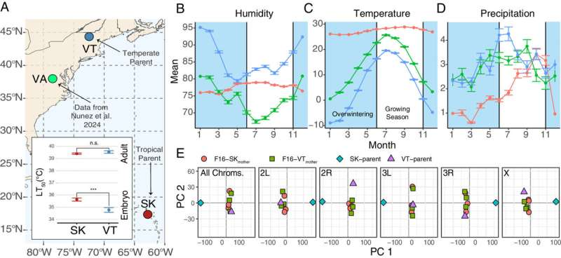 Исследователи из Вермонтского университета провели важное открытие в области биологии, изучив, как мухи-дрозофилы приспосабливаются к изменению климата на самых ранних стадиях жизни. Ученые сосредоточили свое внимание на эмбриональном развитии насекомых и выяснили, что адаптация к температуре начинается еще в яйце. Этот факт стал неожиданностью для специалистов, так как ранее считалось, что гены, отвечающие за развитие зародыша, мало подвержены эволюционным изменениям под влиянием внешней среды. Как сообщает научный портал Phys.org, биологи сравнили генетически различные популяции мух из разных климатических зон Северной Америки. Оказалось, что яйца дрозофил из теплых регионов, например, с Карибских островов, обладают значительно большей устойчивостью к жаре по сравнению с яйцами их сородичей из холодных мест, таких как Вермонт. При этом взрослые особи не показывали столь существенной разницы в переносимости высоких температур. Это наблюдение опровергает прежние научные догмы и доказыв