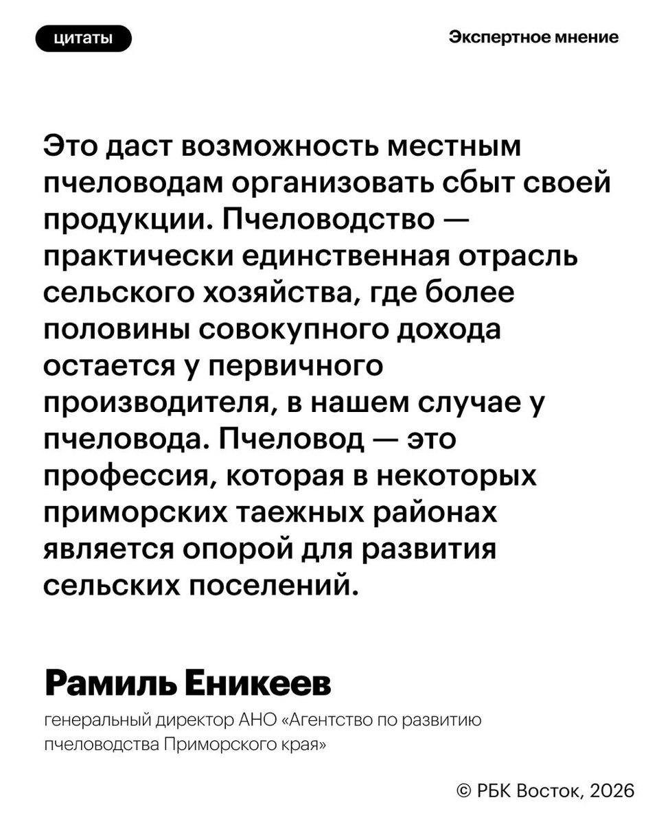 Речь идет о медовых стиках весом 12 гр, которые планируется использовать в рационе школьников и студентов колледжей Проект реализуется в рамках инициативы по включению приморского меда в систему школьного и среднего профессионального питания с 2026 года. Приморские эксперты отмечают, что запуск нового канала сбыта происходит на фоне сложной ситуации в отрасли — в прошлом году в регионе погибла практически половина пчел, а пасеки пережили эпидемию варроатоза. 🔗 РБК Восток в Telegram и MAX