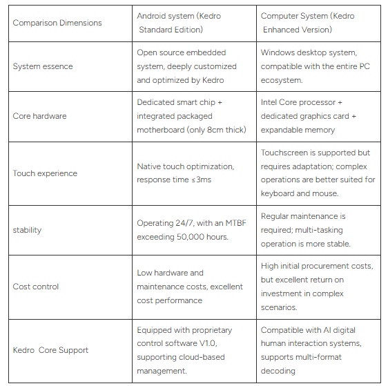 • Выбор системы Android: Если вы являетесь небольшим или средним розничным магазином, пунктом обслуживания населения или другим предприятием, и вам нужна высокая экономичность и низкие затраты на обслуживание, и вы в основном отображаете изображения, короткие видеоролики и простой интерактивный контент, то выберите версию Android от Guangzhou Kedro, которая стабильна, не вызывает проблем и экономична.