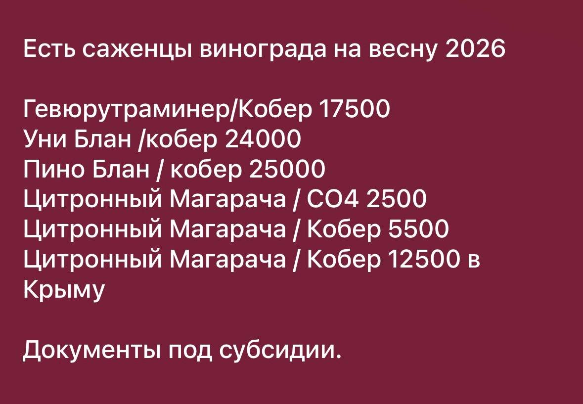 ! В наличии свободный объем саженцев технических сортов винограда. Перечень сортов и количество на фото. Приживаемость 98% Гарантия качества подтверждается сертификатом. Чистосортность 99,9% За подробностями обращайтесь по 📱📞✈️ +79282099329 Вопросы пишите в комментариях ❓ 😀😃😄😆🥹😅🤪😇 Мы ничего не продаем. Мы помогаем купить. интернет-магазин 24/7 здесь Подписывайтесь 🎁🎁🎁🎁🎁 💙 ВКОНТАКТЕ 💬 ОДНОКЛАССНИКИ 📝 ДЗЕН 📺 ЮТУБ 📺 ВК ВИДЕО 📺 РУТУБ ‼️Растения исправят почвы экссудатами‼️