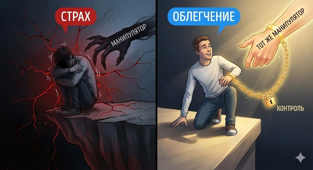 | Психологическая манипуляция через страх и облегчение - это способ взломать волю человека. Сначала его погружают в состояние стресса, а затем "исцеляют" добрым словом или извинением, чтобы получить полный контроль.