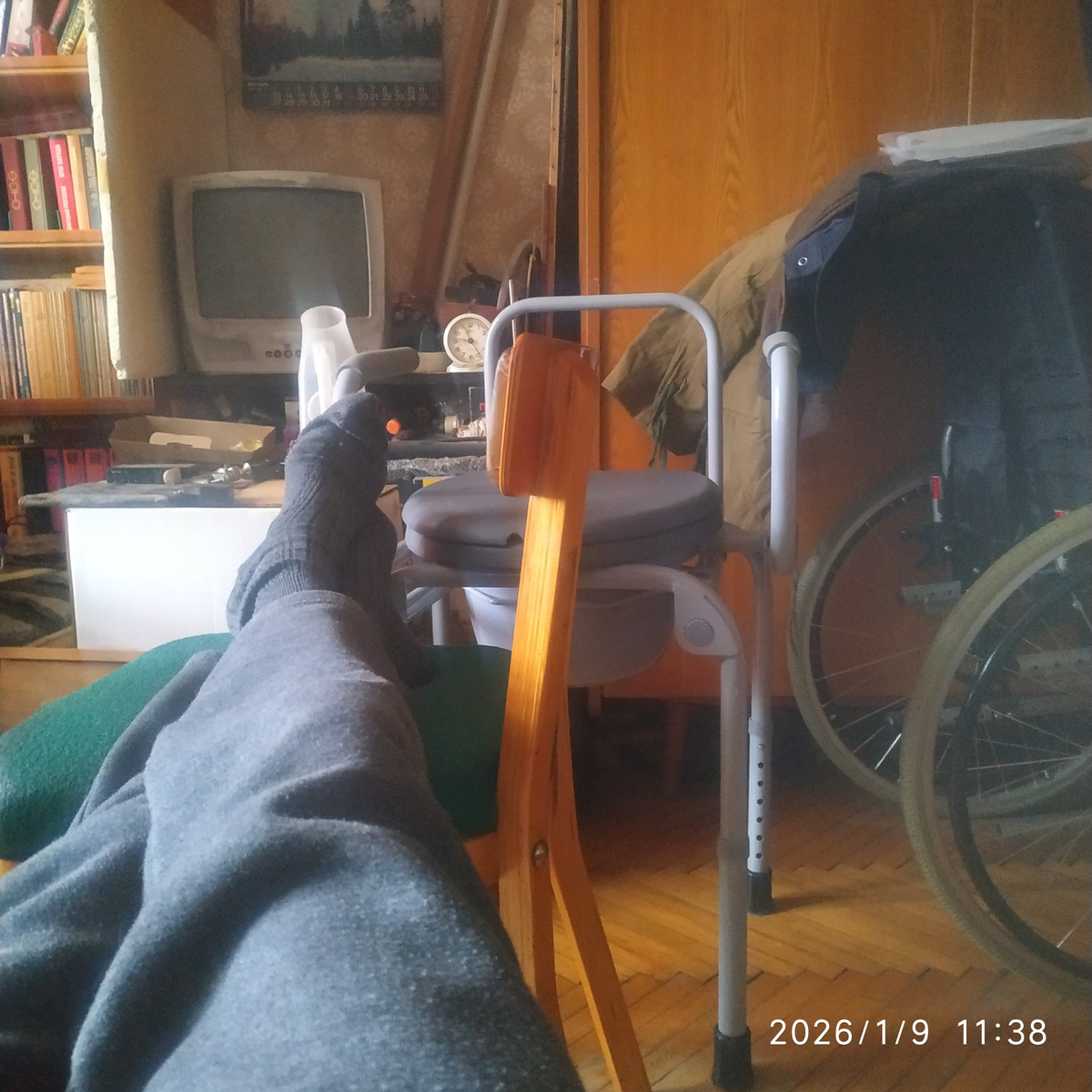 Вообще этому устройству у нас уже года три. Получил я его когда стал инвалидом второй группы. Просто среди кучи прочих дивайсов был и он и маманя его заказала исходя из бессмертного принципа "пусть будет". Все эти года он лежал в в стенном шкафу, но мамане надоело видеть как я ползаю по коридору и она его достала. Правда был он в разобранном состоянии но маманя позвала нашу Светлану с Глебом и они придя всё правильно собрали. А это я просто валяюсь на диване и телефоном щёлкаю свои ноги которые не хотят меня нести к штатному туалету. А сам переносной туалет выглядывает из-за спинки стула.