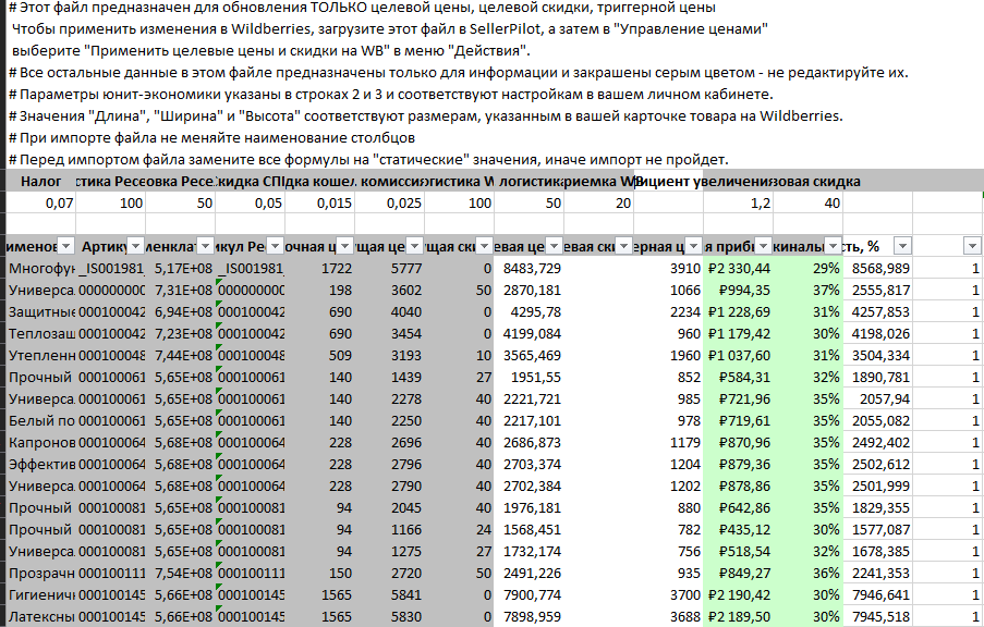 1. Взять финансовую модель ВБ 2. Нужно поменять комиссии по Яндекс Маркету, в столбце X меняем "Комиссию категории, %" 3. Потом убираем скидку вб чтоб правильно расчет маржу в ЯМ 4. Применяем цены новую =($O$3*AE6 + Z6 + AG6 + AH6 + E6 + $B$3 + $C$3 + AF6) / ((1 - I6/100)*(1 - X6/100)) 5. Формируем свою маржу после новых данных по комиссии. Нужно подгонять данные на 30% маржи, сразу цифры с екселя не становится по марже нужно подгонять несколько раз. 6. Берем данные по ценам и скачиваем