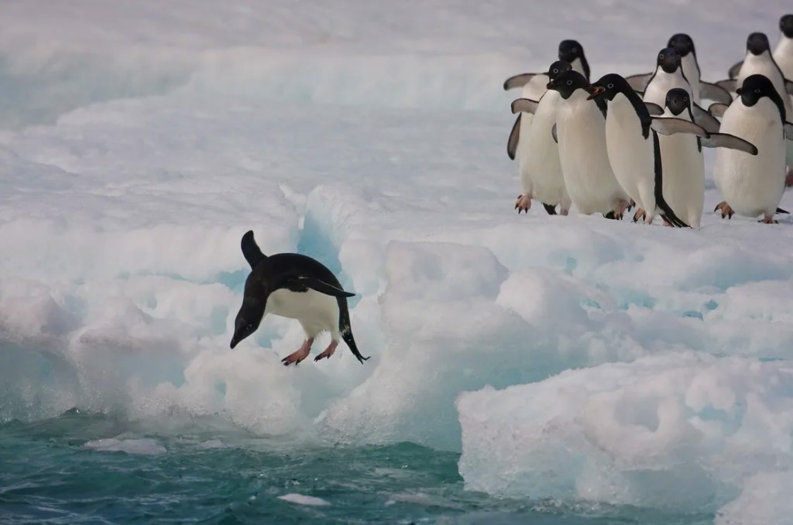 Пингвины могут стоять у края часами. Они толкаются, наклоняются, отходят назад. В итоге кто-то падает в воду первым. Если он выныривает живым — стая мгновенно следует за ним.