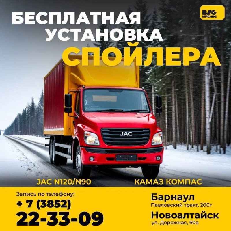 🔧 БЕСПЛАТНАЯ УСТАНОВКА СПОЙЛЕРА для JAC N120 / N90 и КАМАЗ Компас ✅ Улучшает аэродинамику ✅ Снижает расход топлива ✅ Защищает кабину ✅ Повышает комфорт в дальних рейсах ❄️ Особенно актуально во время зимних поездок. 📍 Барнаул, Павловский тракт, 200г 📍Новоалтайск, ул. Дорожная, 60в 📞 Запись: 22-33-09