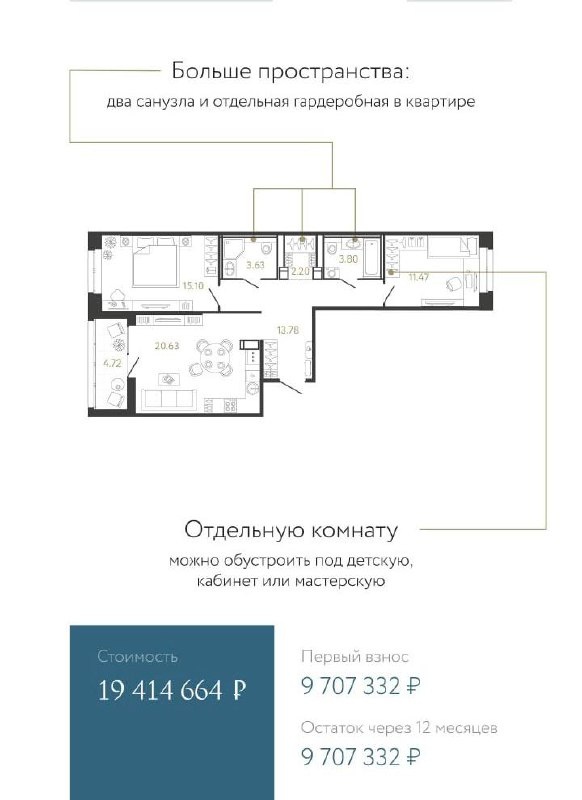 Для вас расчёты планировок в рассрочку 50/50 — со вторым платежом через 12 месяцев.