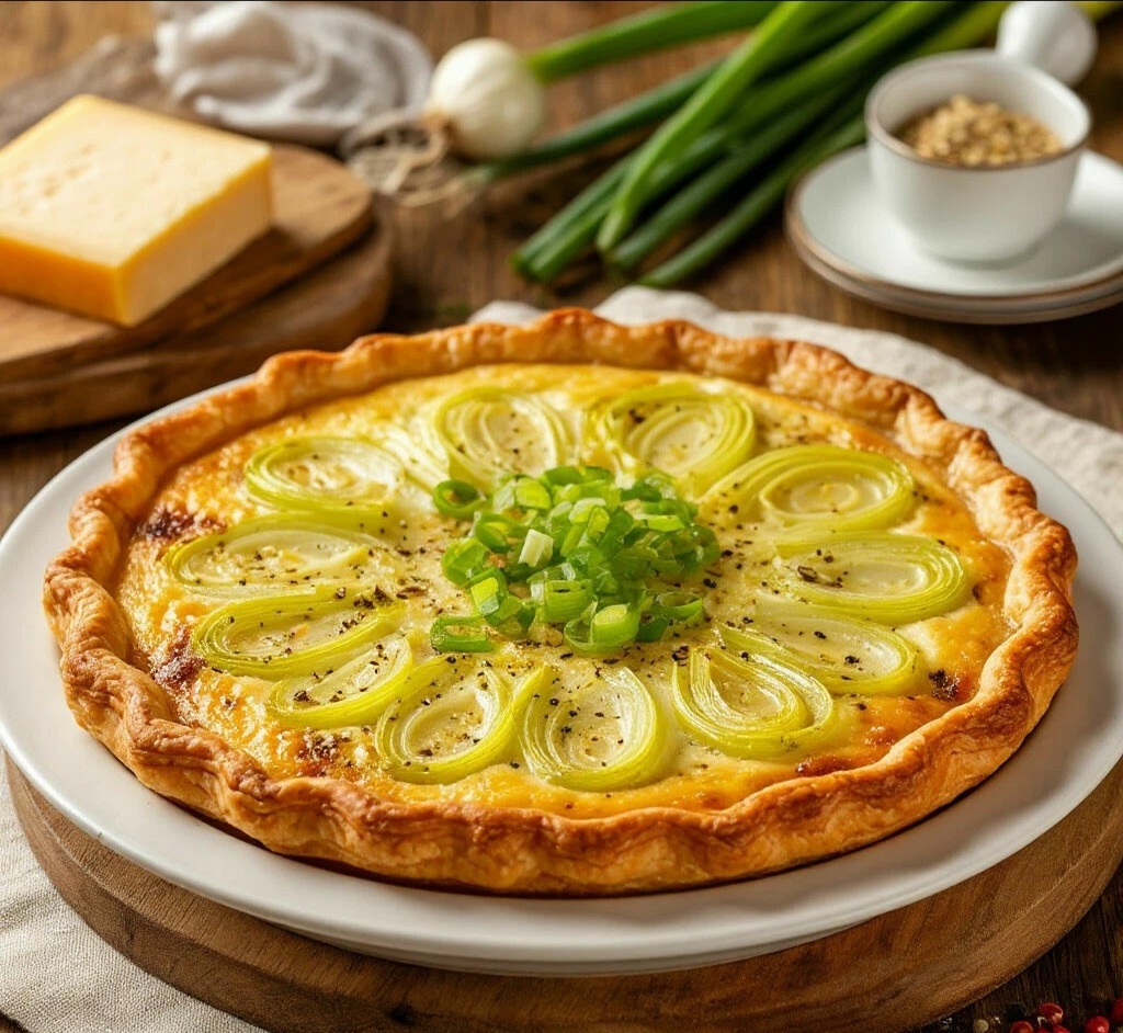ИНГРЕДИЕНТЫ: 🧾 ·Готовое слоёное тесто — 1 пласт (250-300 г) ·Лук-порей — 500 г (только белая и светло-зелёная часть, нарезать кольцами) ·Сливки 20% — 200 мл ·Яйца — 2 шт. 🥚 ·Тёртый сыр грюйер — 100 г 🧀 ·Сливочное масло — 20 г ·Соль, перец, мускатный орех — по вкусу