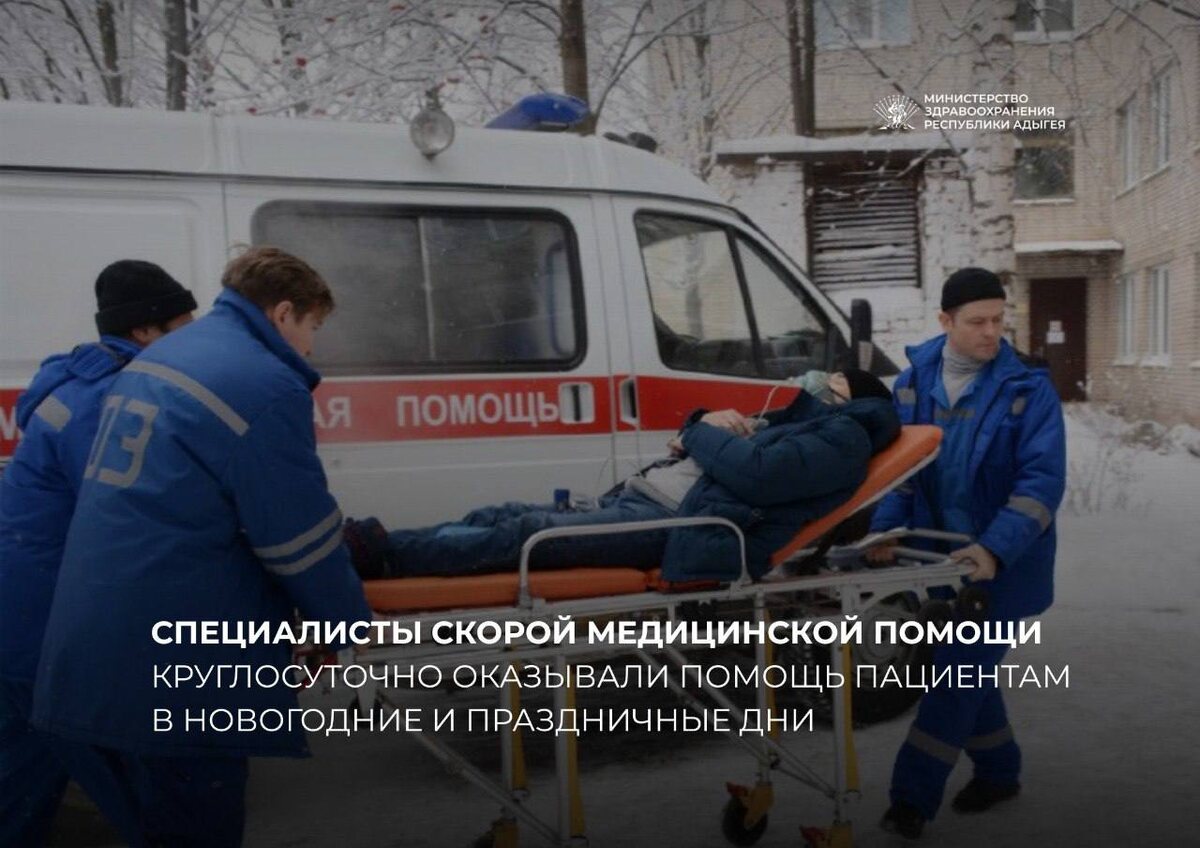 С 30.12.2025 по 11.01.2026 диспетчерская служба СМП приняла около 6800 звонков (500 - 600 в сутки). Наибольшее количество зафиксировано 4 января — 613. В круглосуточном режиме бригады медиков выезжали к пациентам. За этот период выполнено 6224 выезда, из которых 1224 — к детям. Госпитализировано 964 пациента: ▪️АРКБ - 258 ▪️МГКБ - 198 ▪️АРКИБ - 106 ▪️АРДКБ - 73 ▪️ЦРБ - 120 В 18 ДТП пострадало 25 человек, в том числе, 5 детей. За этот же период было зарегистрировано 12 обращений за медицинской помощью пострадавших во время отдыха в горной местности Республики Адыгея (район плато «Лаго-Наки»). Все пациенты с травмами различной локализации, из них 8 детей. Наибольшее количество среди пострадавших составили жители других регионов РФ - 11 человек:(Краснодарский край - 9, Ростовская область - 1, Астрахань - 1). Всем пациентам была своевременно оказана необходимая медицинская помощь. Благодарим коллег за работу и круглосуточную помощь пациентам ❤️ 💬Минздрав Адыгеи в МАХ