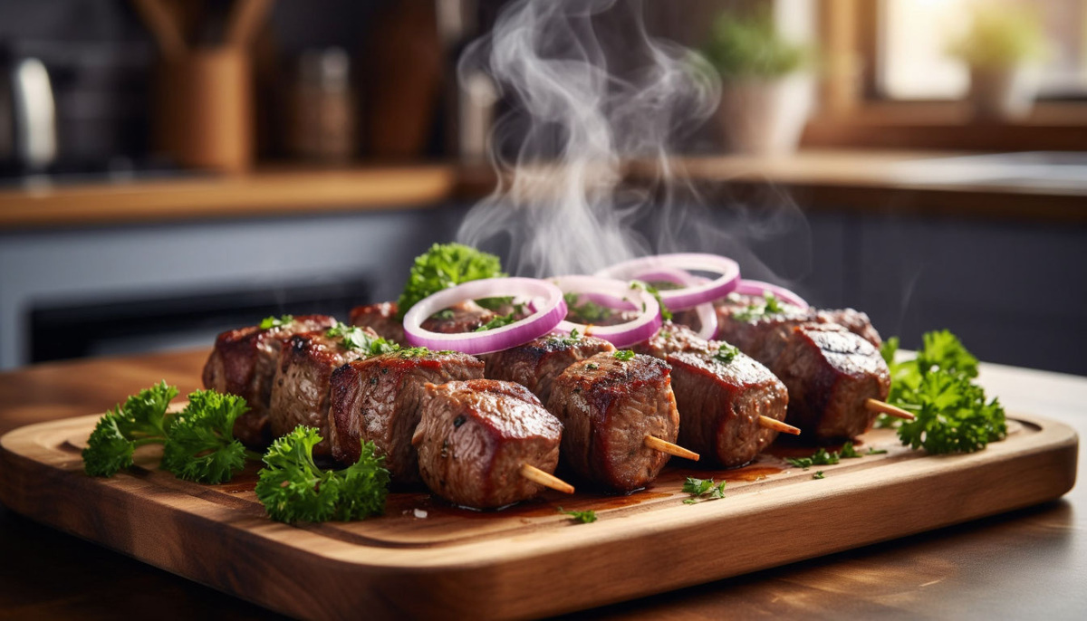 Обязательно подавайте с маринованным луком (уксус + сахар + укроп + холодная вода). Этот запах уксуса и лука прочно ассоциируется с шашлыком и обманывает мозг, достраивая картину «пикника».