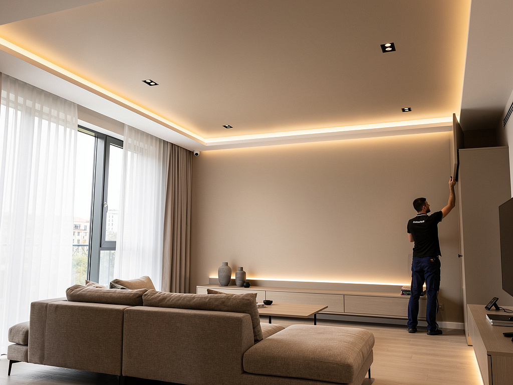 LED-лента по периметру потолка за скрытым карнизом создаёт ощущение, что потолок "плывёт" в воздухе. Это мягкий, непрямой