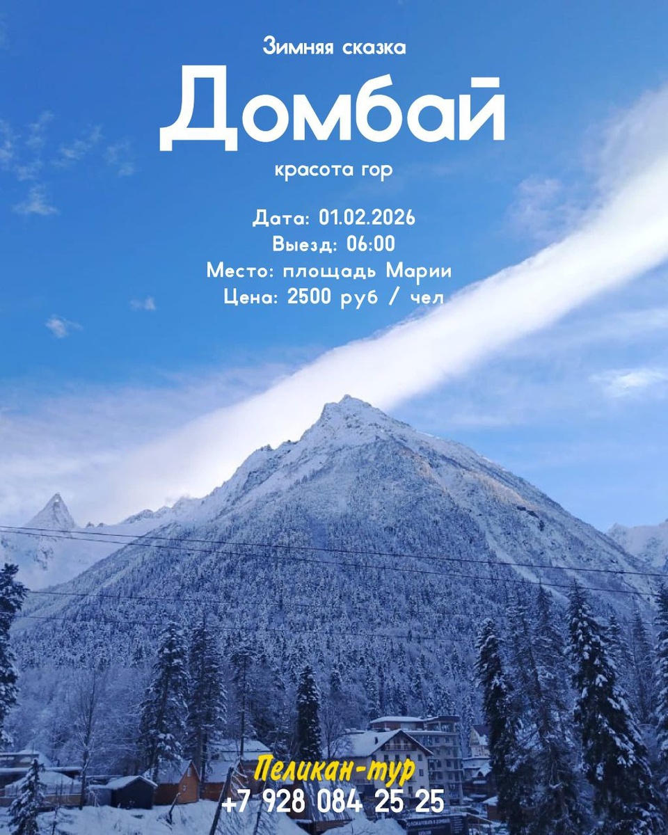 ❄️💙💙💙💙💙💙 💙💙💙💙💙💙❄️ 🏔 Зимние выходные в Домбае — лучший способ провести каникулы в горах и зарядиться энергией! ❄️ В нашу короткую зимную поездку мы постараемся вместить все самое интересное: живописное ущелье, озеро, горные реки и сам Домбай. Дата выезда: 01.02.2026⛄️ ⛄️Мы отправляемся в путь с пл. Марии в 6:00 утра и проведем насыщенный день, чтобы у вас было время насладиться каждой минутой этого волшебного приключения. Ваша комфортная поездка — на современном микроавтобусе, а дорога к удивительным вершинам будет приятной и удобной. 💸 Стоимость — 2500 рублей на человека (канатная дорога оплачивается дополнительно). 🚠Поднимемся на канатной дороге к ледниковым пикам, полюбуемся панорамой Кавказа — сверху откроется потрясающий вид на водопады и всю диковинную природу Домбая, которая в ясную погоду покажется вам с высоты птичьего полета. ❄️Здесь ощущается масштаб планеты, сила гор и неподдельная красота, созданная самой природой — страна синего неба, солнечных верш