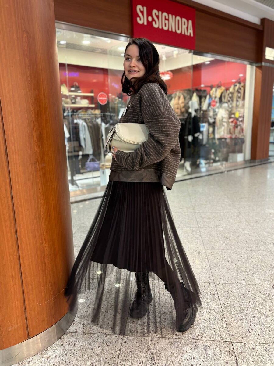 Интересный комплект с шифоновой юбкой, которая в образах уже стала амбасадором легкости и грации. Теплый джемпер в цвет от Background Italy 🇮🇹 Плюс детали, которые собирают вместе наш кофе с молоком в модный латте 🤍🌟