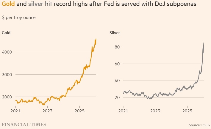 Долгосрочные инфляционные ожидания выросли после того, как прокуратура США начала уголовное расследование в отношении председателя совета директоров ФРС Джея Пауэлла В понедельник золото достигло рекордной отметки, а доллар снизился после того, как прокуратура США инициировала уголовное расследование против председателя Федеральной резервной системы Джея Пауэлла. Это усилило опасения относительно независимости центрального банка. Цена на золото выросла на 2,7% и превысила 4600 долларов за тройскую унцию, доллар упал на 0,3% по отношению к основным валютам, таким как фунт и евро. Серебро подорожало на 7,8% и достигло нового максимума — более 86 долларов за тройскую унцию. Американские акции немного восстановились после недавнего падения и показали небольшой рост. Доходность 10-летних казначейских облигаций увеличилась почти до 4,21%, но к обеду в Нью-Йорке снизилась до 4,18%. «Существует риск, что в ближайшие кварталы отношения между Белым домом и ФРС станут напряжёнными», — отметил Кев