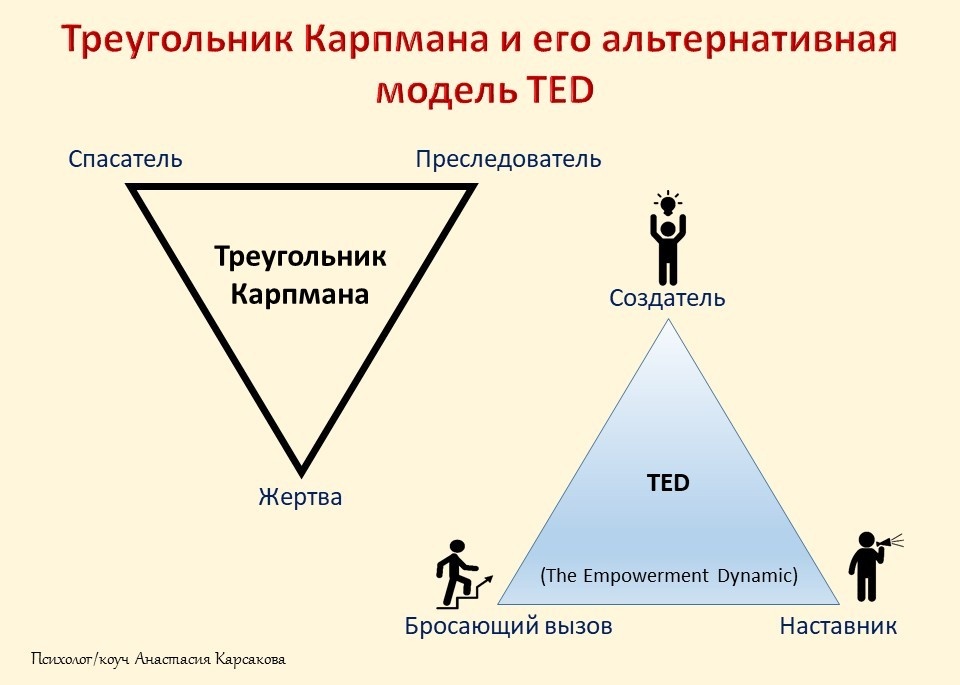 Альтернативная модель: TED (The Empowerment Dynamic) – социальная модель позитивного человеческого взаимодействия, впервые описанная в 2005 году Дэвидом Эмеральдом (David Emerald). Это коучинговая переработка треугольника Карпмана.