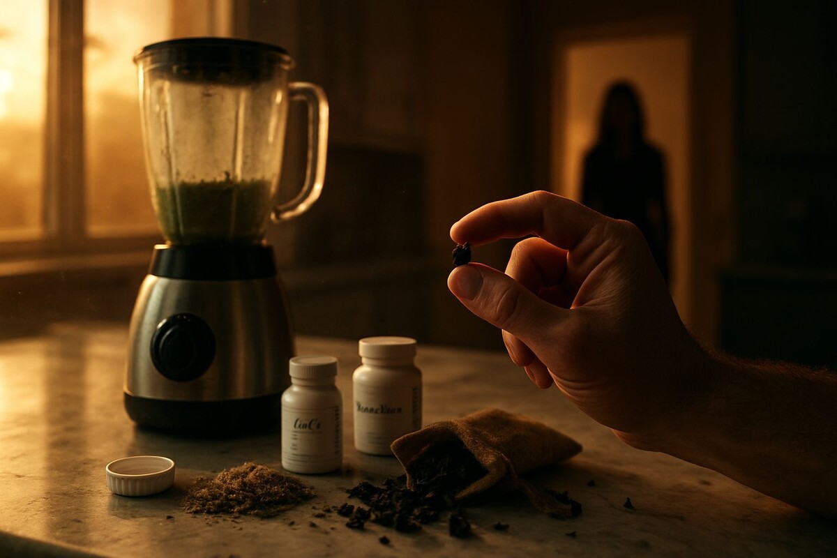 На кухне я застал её врасплох. Маша стояла спиной, её плечи слегка вздрогнули, когда скрипнула половица под моей ногой. На столе перед ней лежали пустые баночки от моих витаминов — цинк и магний, которые я теперь принимал через силу, по её настоянию. И странная, пыльно-зелёная смесь в стеклянной чаше блендера. Она обернулась, улыбнулась, но уголки её губ дрогнули. В воздухе висела пыльца горьковатых трав, перебивающая сладковатый запах корицы.