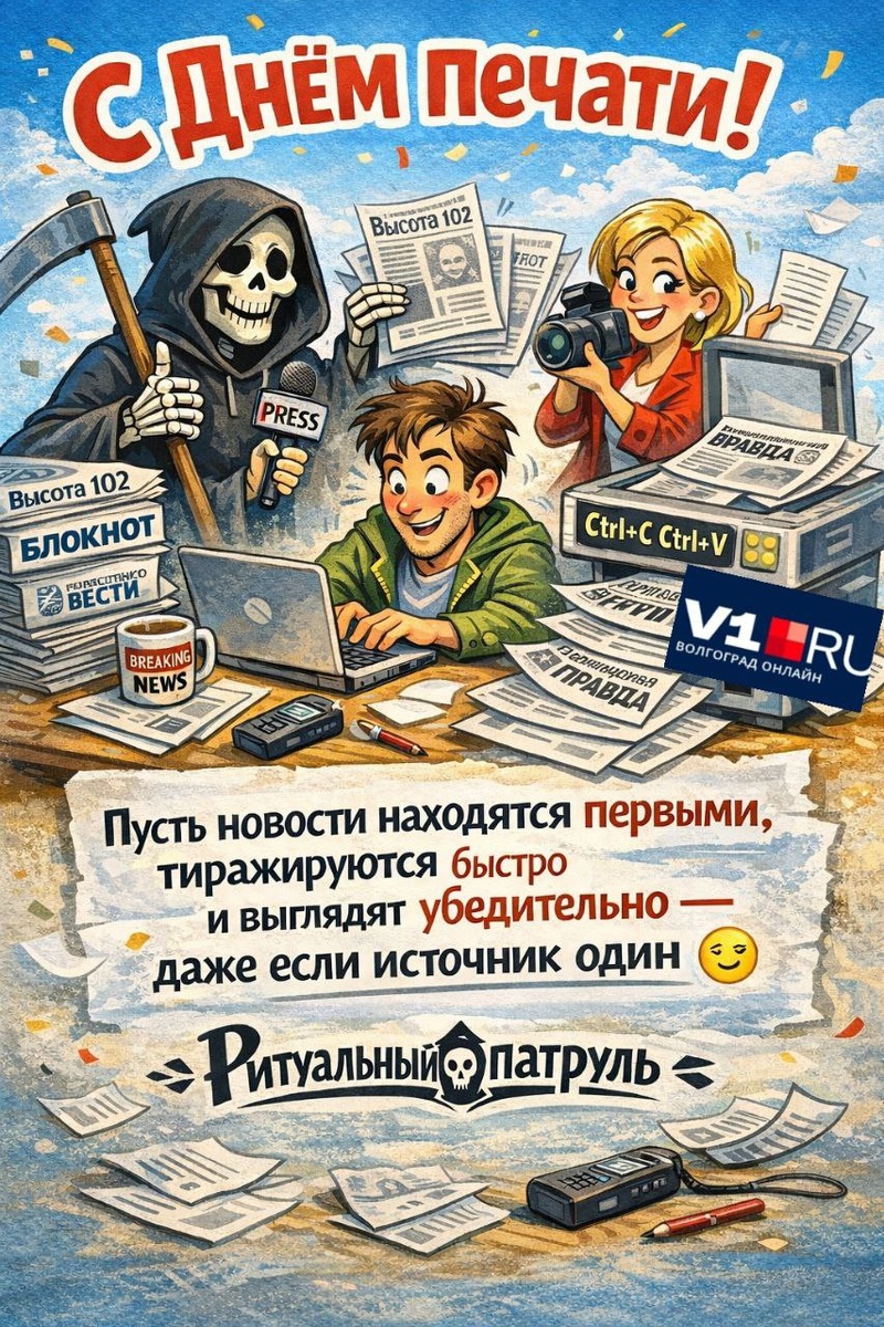 Дорогие наши журналисты,коллеги по информационному фронту и ценители эксклюзивных новостей (иногда даже слишком ценители)! 🖋️ Поздравляем вас с профессиональным праздником! Вы — та самая движущая сила, которая превращает наши скромные сводки в горячие новости. Без вашей способности находить, тиражировать и, что уж греха таить, иногда «одалживать» информацию, мир был бы куда скучнее. Мы ценим наш симбиоз: мы копаем, а вы — транслируете. Пусть ваш внутренний редактор никогда не знает покоя, а в погоне за новостью вас всегда обходят только курьеры с пиццей. Желаем вам вечно горящих дедлайнов, неиссякаемого запаса кофе и, конечно, стабильных ссылок на первоисточник (нам же приятно!). С праздником, партнеры по медиамиру! #ДеньПечати #Журналисты #РитуальныйПатруль #Новости #Поздравление