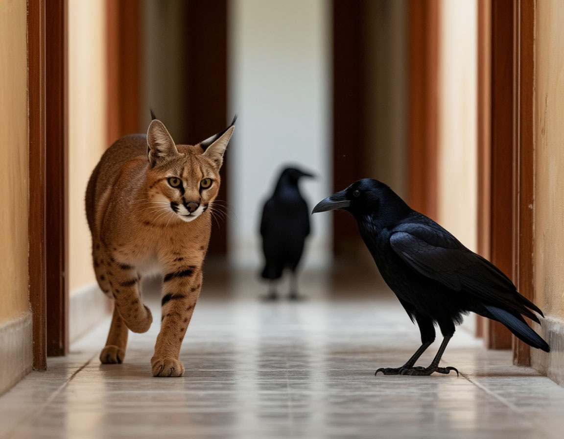 Братья-вороны опешили от странного кошака песочного цвета с собаку размером, со здоровенными кисточками на угольно-чёрных ушах и непонятным чириканьем, но разобравшись в ситуации, с радостью принялись его поддразнивать, играя роль живых игрушек.