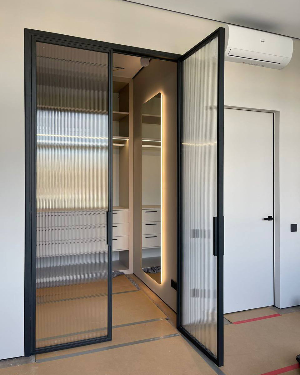В интерьере загородного дома в КП «Современный квартал» мы установили распашные двери серии Loft-S. Это решения с алюминиевым профилем в матовом цвете антрацит и рифлёным стеклом Moru, которое мягко рассеивает свет и создаёт ощущение приватности без утяжеления пространства. Распашные двери ведут в гардеробную — за стеклом уже читается система хранения, но интерьер при этом остаётся лёгким и визуально цельным. В этом же проекте мы выполнили раздвижные перегородки серии Loft. Они поддерживают общую архитектурную логику интерьера и позволяют гибко зонировать пространство. Сейчас дом находится в процессе реализации, отделка и мебель ещё в работе, но уже на этом этапе видно, как графика алюминиевых рам и фактура стекла формируют характер интерьера и задают его ритм.