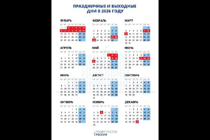 Но кто сказал, что нельзя уже планировать следующие выходные? Первый продолжительный отдых наступит в конце зимы. В честь Дня защитника Отечества выходные продлятся с 21 по 23 февраля — с субботы по понедельник. К рабочим делам вернемся во вторник, 24 февраля. Почти сразу после этого — еще один повод выдохнуть. Выходные в честь Международного женского дня продлятся с субботы, 7 марта, по понедельник, 9 марта. Майские праздники в 2026 году разделят на два трехдневных периода. День труда отметят с 1 по 3 мая, а День Победы — с 9 по 11 мая. Летом длинные выходные будут всего одни. На День России отдохнем с 12 по 14 июня. Фото правительства РФ 🔷🔹Подпишись на новости Иркутска Мы в MAX