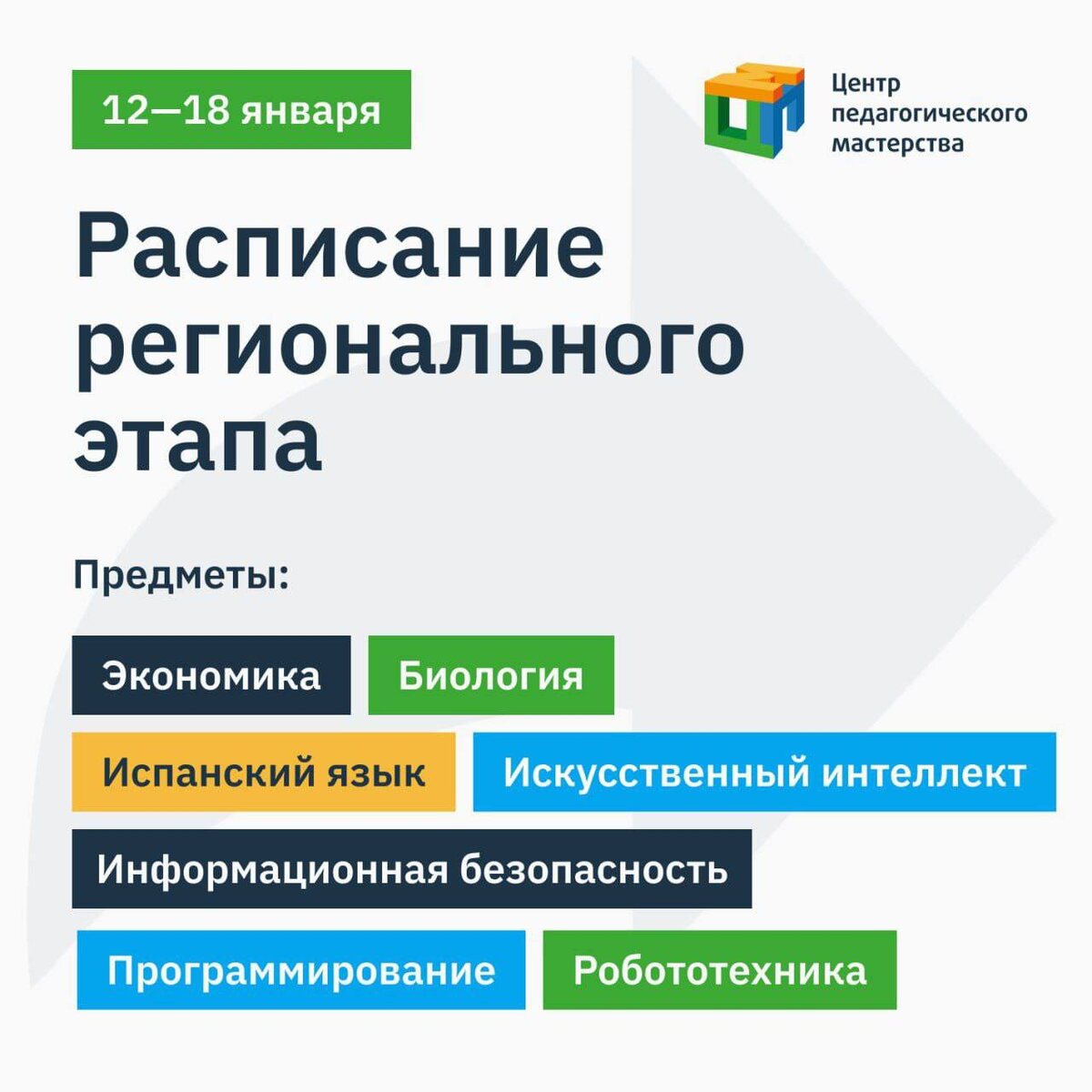 Активно начинаем рабочие будни вместе с дайджестом предметов, по которым уже на этой неделе начнется региональный этап Всероссийской олимпиады школьников. 🔘Экономика 12 января 🔘Биология 13, 15 января 🔘Испанский язык 14, 16 января 🔘Искусственный интеллект (в рамках предмета «Информатика») 17 января (и 19 января) 🔘Информационная безопасность (в рамках предмета «Информатика») 17 января (и 19 января) 🔘Программирование (в рамках предмета «Информатика») 17 января (и 19 января) пробный тур 08-15.01, тренировочные туры 08-12.01 🔘Робототехника (в рамках предмета «Информатика») 17 января (и 19 января) итоговая версия единого технического задания для проектного тура, сбор проектов до 23:59 12 января #экономика #биология #испанский_язык #информатика 💌 Больше информации на нашей странице в МАХ!