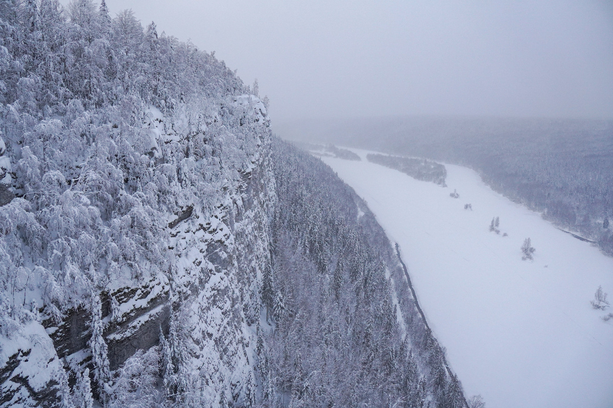 Первая горная точка, нашего небольшого путешествия. Это не гора, это система утёсов, получивших название Ветлан. Простой маршрут, в одну сторону 3км, небольшой набор высоты, ведь Камень Ветлан всего 263м. над уровня моря. Высота утёса 100м. Даже в неясную погоду вид на отвесную стену открывается фантастический. В хорошую погоду можно увидеть гору Полюд. Начало маршрута находится в 8 километрах от города Красновишерск, ближайший населённый пункт посёлок Набережный. На одном из фото можно увидеть небольшую парковку, прямо у начала подъема. Нам удалось поставить там нормально машину, в новогодние праздники представляете сколько желающих. Для парковки это конечно плохо, но люди изучающие свои края, путешествующие, это хорошо. Для "ленивых" или людей, которые хотят, но физически не могут пройти маршрут, сейчас возят на снегоходах в прицепных санях. Сколько здесь стоит услуга мы не узнавали. Гоняет их очень много, некоторые ооочень вонючие, это тоже диссонанс, ведь мы находимся в Вишерском з