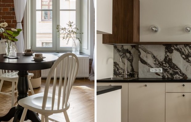 В этом проекте кухня стала инженерной задачей и одновременно аккуратной частью жилого пространства Эти апартаменты площадью 30 м² в Санкт-Петербурге дизайнер Екатерина Шейн оформляла для сдачи в аренду. Одним из ключевых ограничений стал единственный стояк, расположенный в дальнем углу санузла: застройщик изначально не предусмотрел место под кухню. В результате планировку пришлось выстраивать так, чтобы сохранить удобство для арендаторов и не превратить кухню в случайный элемент интерьера. Размещать кухню в прихожей дизайнер сознательно отказалась — для студии такого метража это выглядело бы неестественно. Кухонную зону перенесли к входу в жилое пространство, максимально приблизив ее к санузлу: решение позволило логично подвести коммуникации и сохранить цельность планировки. Кухню разделили на два блока, расположенных напротив друг друга. В одном — мойка, варочная панель и рабочая поверхность, в другом — мини-холодильник и микроволновая печь. Прием сделал кухню функциональной, не превр