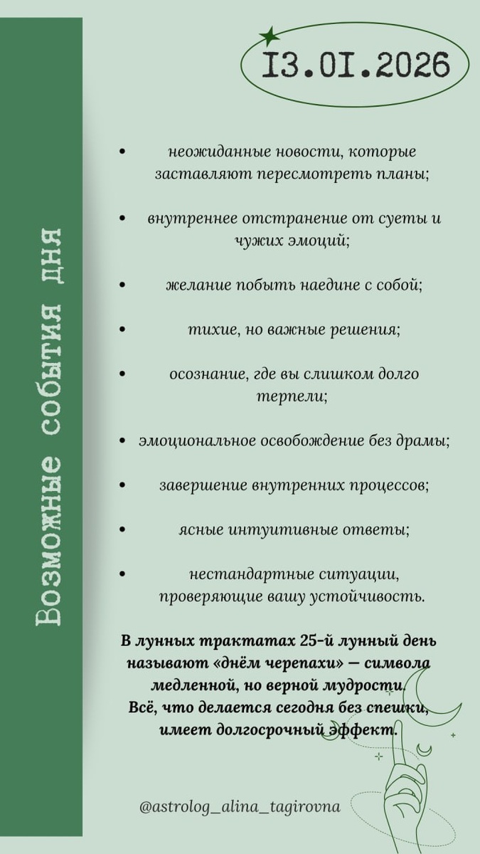 1️⃣3️⃣ января, вторник В 04:29 начало 2️⃣5️⃣-го Лунного дня Убывающая Луна в знаке ♏️Скорпион Общая характеристика дня 13 января — тихий, зрелый и очень мощный день внутренней настройки. 25-й лунный день традиционно считается днём уединения, мудрого наблюдения и восстановления энергии. Он не про активные рывки, а про глубокое внутреннее «дозревание». Луна в Скорпионе усиливает чувствительность и проницательность, а гармоничные аспекты к Венере и Марсу в Козероге дают редкое сочетание: эмоциональная глубина + практичность + внутренняя собранность. Тригоны к Сатурну и Нептуну в Рыбах создают сильный духовный канал: интуиция сегодня спокойная, ясная и надёжная. Это день, когда можно почувствовать внутренний стержень, не доказывая его миру. Оппозиция к ретро-Урану может давать внезапные внешние раздражители, но они нужны лишь затем, чтобы вы чётче поняли: что вам больше не подходит. Вопросы дня: ❓Где мне важно замедлиться?! ❓Что во мне требует тишины и заботы?! ❓От чего я готов(а) от