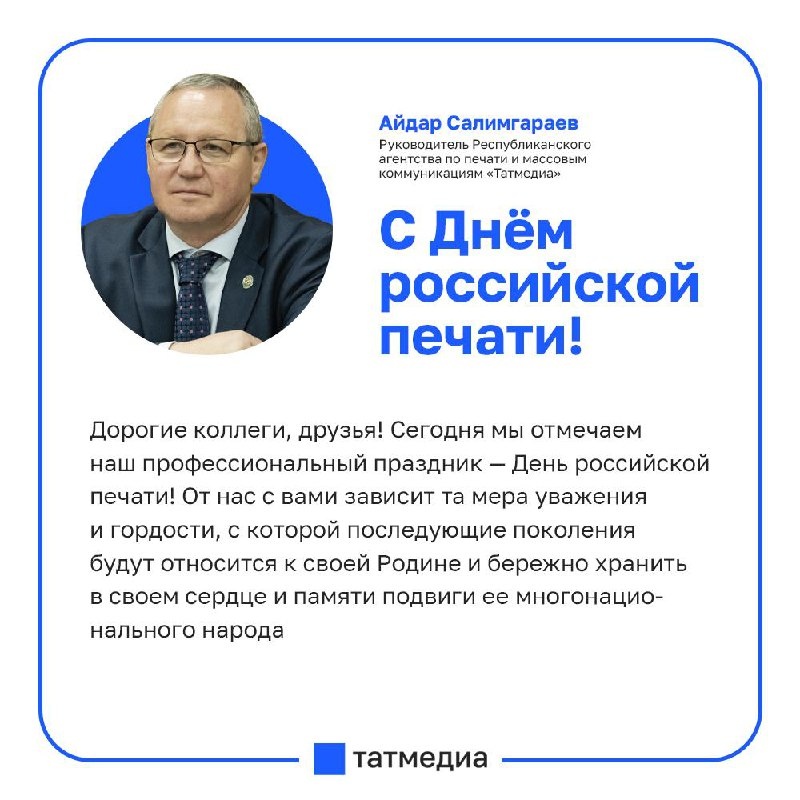 В День российской печати Руководитель Республиканского агентства по печати и массовым коммуникациям «Татмедиа» поздравил медиасообщество Татарстана. «В этот день уместно напомнить, что журналистика – это не только общее дело всех, кто формирует медиаотрасль, но и почетная миссия по укреплению общественного сознания и сохранению связи поколений», – отметил он. Айдар Салимгараев подчеркнул, что от работы журналистов зависит, «с какой мерой уважения и гордости последующие поколения будут относиться к своей Родине». В завершение он поздравил коллег с профессиональным праздником и пожелал благодарных читателей, зрителей и слушателей, а также успехов в исполнении профессионального долга. @tatmediaofficial | Все каналы Татмедиа ™️ 1-й новостной MAX-канал Татарстана - подпишитесь.