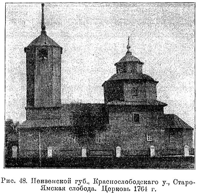 (Темниковский район, с.Старая Ямская Слобода) Село впервые упоминается с 1695 года, когда там была построена деревянная Никольская церковь. Инициаторами строительства были священник Леонтий и церковный староста ямщик Дмитрий Васильев. Храм несколько раз страдал от пожаров, поэтому в 1764 году ямщики возвели вместо обветшавшей новую деревянную церковь с прежним наименованием, но уже с теплым приделом в честь великомученицы Варвары. В XIX веке последовали новые переделки, которые не имели серьезного значения для облика храма, например в 1873-74 годах перестраивалась колокольня. Никольская церковь славилась своим иконостасом, иконы для которого заказывались в лучших мастерских Москвы. Слобода была поселением темниковских ямщиков. Село славилось предприимчивостью своих жителей, умственной развитостью и грамотностью населения. Хотя число жителей (вместе с приписными деревнями) даже в лучшие времена не превышало 1000 человек. В 1869 году оно было учтено как Старо-Ямская Слобода Краснослободс