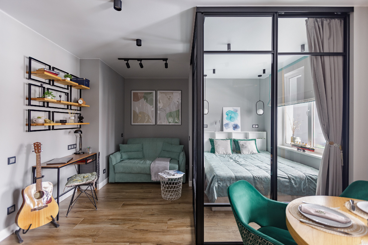 Что, если интерьер может существовать сразу в нескольких измерениях – практичности, эстетики и ощущений? В однокомнатной квартире площадью 37,8 кв. м в Санкт-Петербурге дизайнер Яна Кочетова соединила природные мотивы Карелии и продуманный функционал. Проект «Третье измерение» – это попытка выйти за пределы привычных метров: в получившемся пространстве разместились зоны кухни, гостиной, спальни, кабинета и даже гардеробная. Как такое стало возможным, рассказываем в нашей статье. Этот дизайн-проект – история о раскрытом потенциале квадратных метров обычной однокомнатной квартиры. Перед дизайнером Яной Кочетовой стояла задача создать пространство, где будет место и для работы, и для отдыха. В основе идеи – философия «Третье измерение», где важна не только площадь, но и ощущение глубины, гибкости и свободы выбора. Например, в интерьере появились стеклянные перегородки, которые отделяют зону отдыха от остального пространства. Шторы здесь позволяют управлять настроением: можно открыть их и