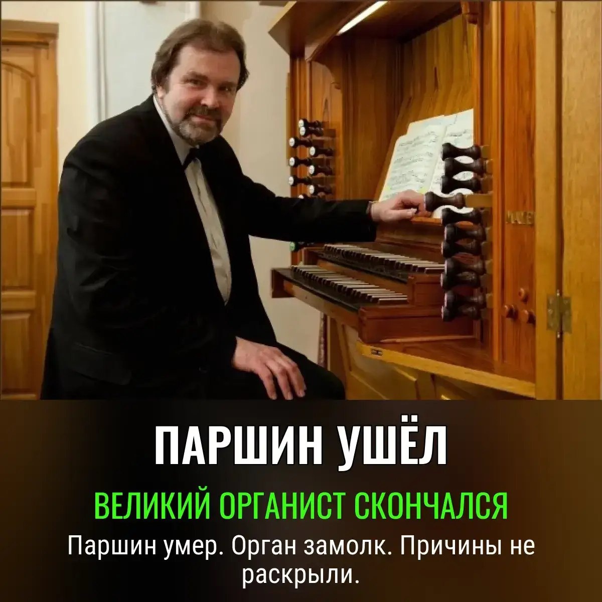 Прощание — как обычно, с ноткой скорби, скрипом скамьи и плачем диковинных поклонников органа. Причины смерти, конечно, тайна покрытая мраком — видимо, чтобы не портить репутацию. Коллектив «органистов-педагогов» уже назвал это «невосполнимой потерей». Оказывается, для культуры органа найдётся место и для траура. ⛪️ Следуем дальше: в этом году отечественная музыка реально осиротела — сначала альтист, теперь органист., Следите за новостями 📩