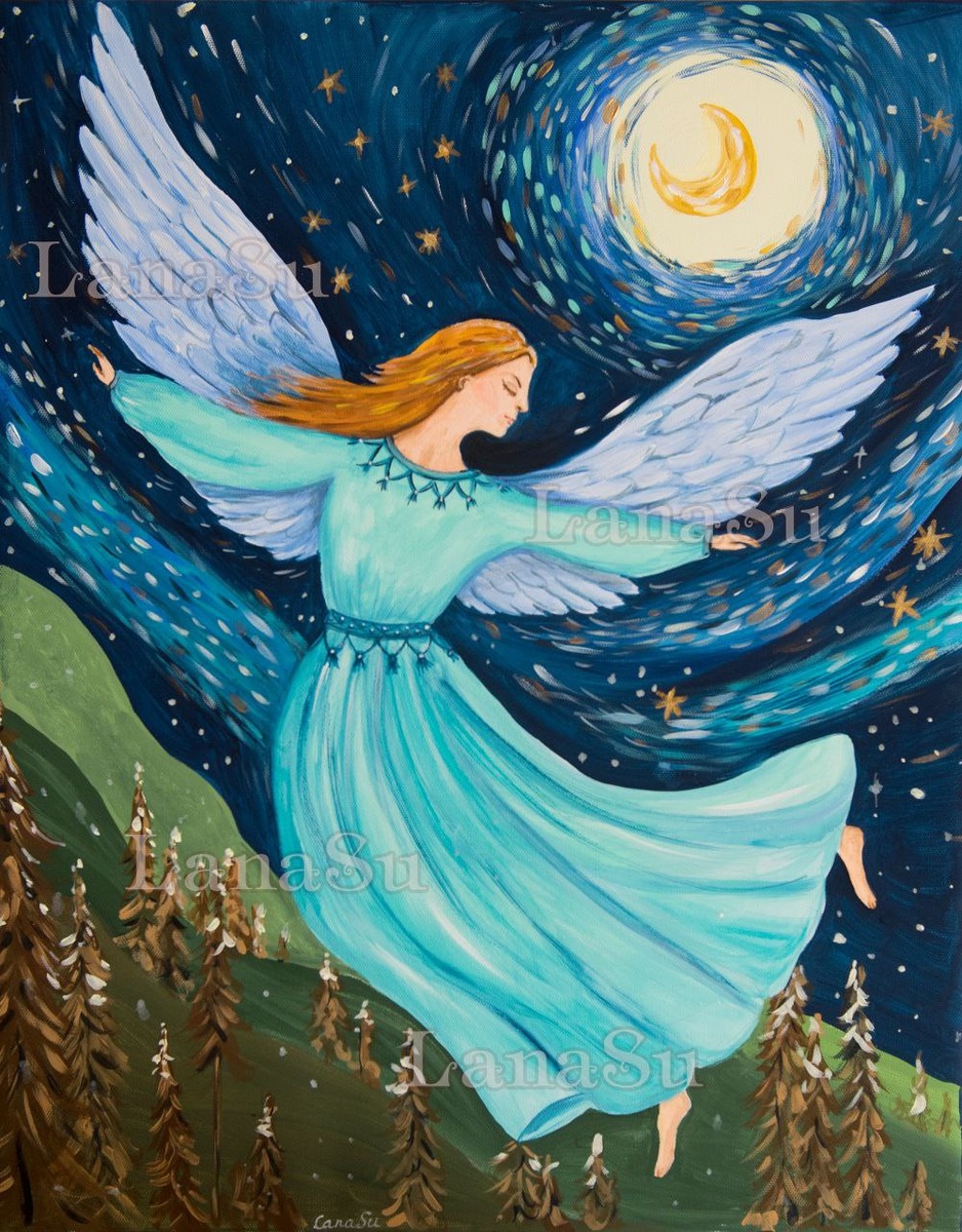 Картина «У ночи на крыльях» Холст на подрамнике, акрил, размер 50х40 У сюжета этой картины довольно долгая история. Летом 2025 года я принимала участие в одном арт-марафоне с этнографической тематикой. Рисовали миры, которые существуют только в нашем воображении, природные явления, духов этих земель, города и аборигенов. В моих мирах персонажи получались крылатыми, тотемы - летающими женщинами. Меня очень увлекла эта тема и я продолжила ее уже как психолог, начав создавать арт-терапевтическую практику для своих клиентов. Но образ нежного женского образа с крыльями меня не покидал. Ночь - тихое время, и даже самым сильным нужен покой и защита их сна. И только поздней осенью окончательно сформировался образ. Мне очень хочется, чтобы от картины "У ночи на крыльях" любой мог почувствовать спокойствие, защиту и теплые объятия. ❤💫