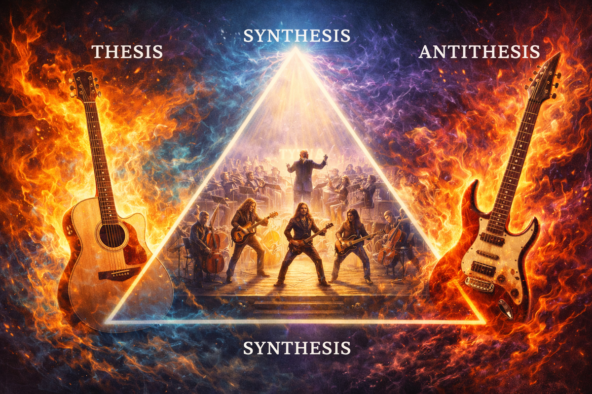 Музыкальный мир, как и мир философии, постоянно развивается через столкновение противоположностей. В этой статье мы рассмотрим, как диалектический метод, упрощённо представленный формулой «тезис — антитезис — синтез», проявляется в эволюции тяжелой музыки. Начнём с основ. Философ Гегель в своей «Науке логики» описывал логический процесс через триаду «понимание — диалектическое суждение — спекулятивное суждение». Однако, чтобы не углубляться в сложные философские дебри, воспользуемся упрощённой версией, предложенной Генрихом Халибеусом: тезис, антитезис и синтез. Тезис — это исходное утверждение, антитезис — его отрицание, а синтез — разрешение противоречия, объединяющее элементы обоих. Как это работает в музыке? Возьмём вокал. Чистый вокал (тезис) предполагает красивые мелодии, понятные тексты. Но в противовес ему возник гроулинг (антитезис) — рычание, издаваемое вокалистом, когда разобрать хоть слово становится непосильной задачей для большинства слушателей. И что получилось в результ
