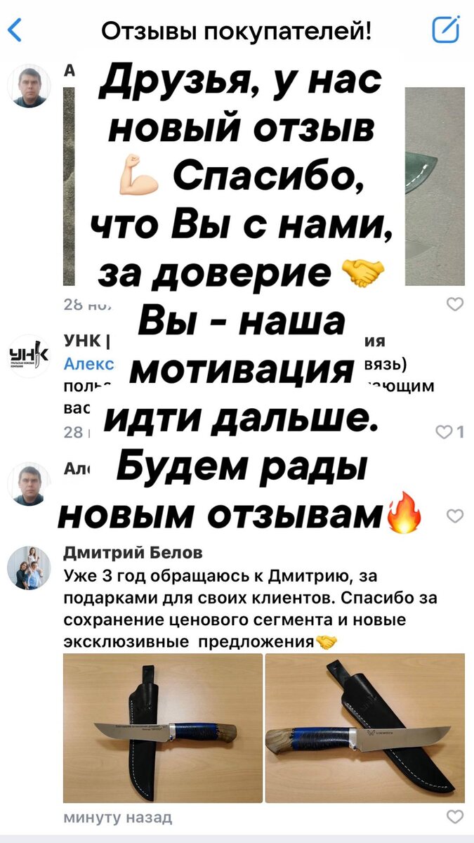 💪🏻 Спасибо, что Вы с нами, за доверие 🤝 Очень приятно осознавать, что наши ножи дарят директора компаний своим партнерам 😎 Очень ждём обратную связь от всех наших покупателей 😉
