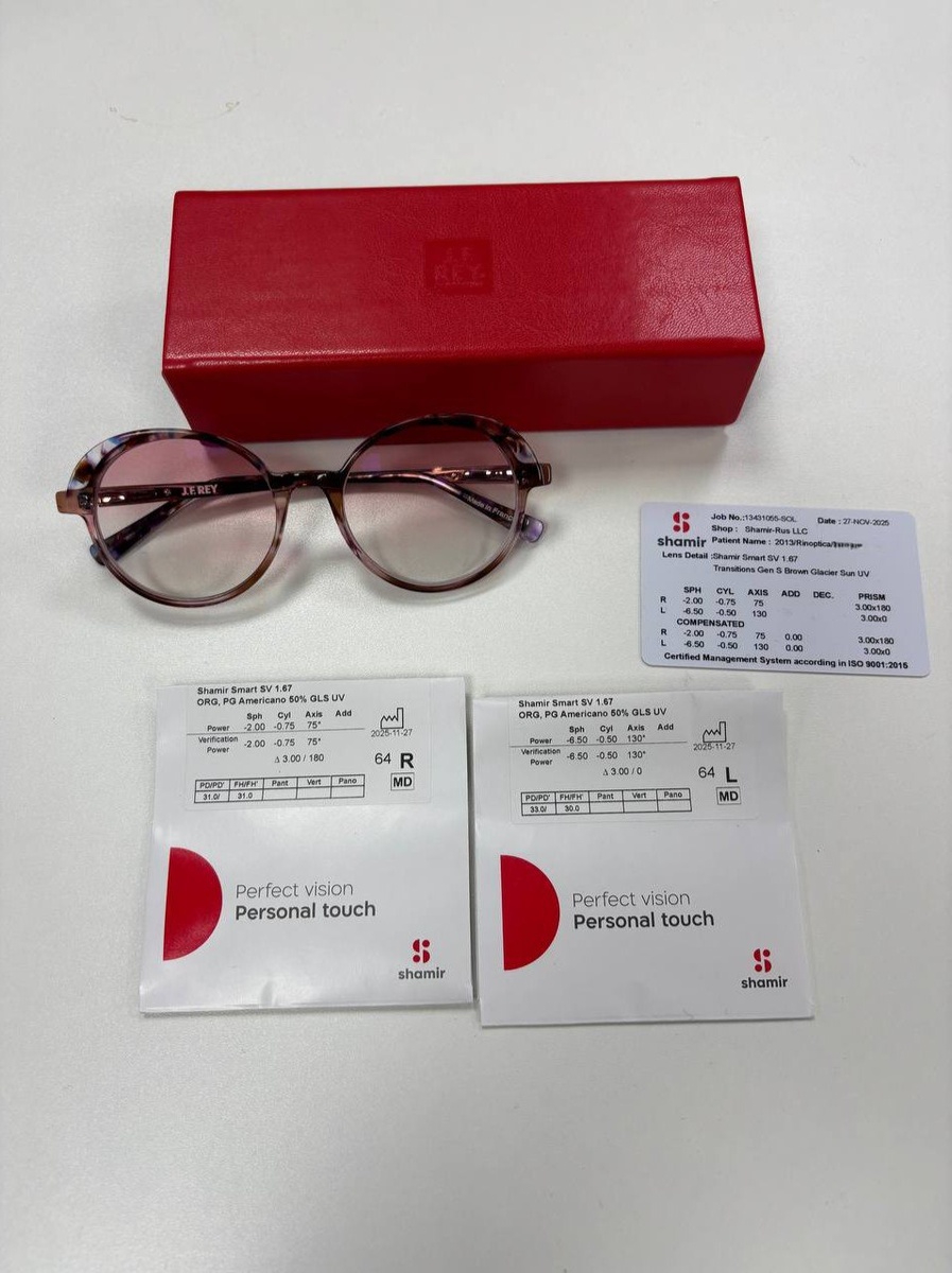 Это изделие — доказательство того, что очки с призмами могут не выдавать внешне свой секрет и выглядеть очень красиво. У нашей пациентки миопия с большой разницей в диоптриях между правым и левым глазом и бинокулярное нарушение, требующее призматической коррекции по 3 призмы на каждый глаз. Линзы в этих очках индивидуальные. Они дополнены технологией Photo Glamour. Линза слегка затонирована розовым градиентом, а на улице под действием ультрафиолета очки затемняются ещё сильнее. Оправу наша пациентка выбрала от французского бренда J. F. Rey. Наталья Ринская РИНОПТИКА 👓