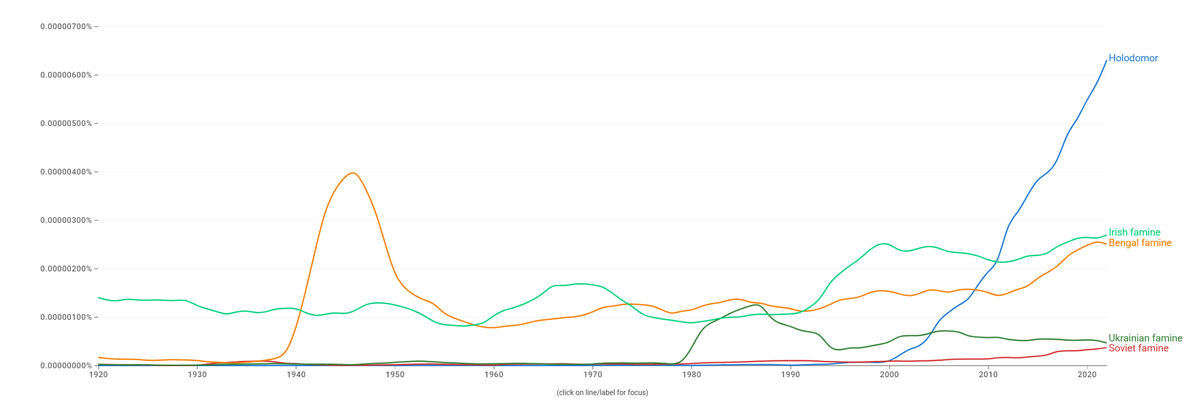 Это диаграмма Ngram, построенная на основе поиска в Google по запросу термина Holodomor (Голодомор), а также некоторых других, достаточно известных фактов голода. Голодомор — это сконструированная идея, появившаяся сравнительно недавно. Судя по графику Ngram, можно увидеть, что о голодах в истории писали давно, и интерес к ним то возрастал, то снижался. Но обратите внимание: согласно этому графику, упоминания Голодомора в печати превышают упоминания Бенгальского голода… в тот момент, когда тот реально происходил. Возможно, это отражает не исторический интерес, а интерес к самому понятию? Если посмотреть на Google Trends по запросу «Holodomor», видно, что интерес к нему долгое время был относительно стабильным — вплоть до марта 2022 года. Затем запрос резко взлетел, после чего снова снизился. В ноябре 2022 года произошёл новый всплеск — он совпал с кампанией украинского правительства по признанию Голодомора геноцидом и сопровождался масштабной медийной поддержкой. После этого интерес вн