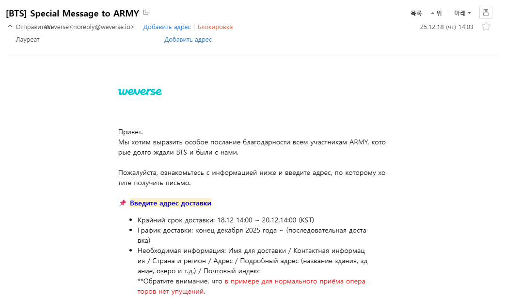 Весь мир уже в курсе, что где-то в середине декабря на электронную почту членам фанклуба BTS с золотым членством пришло послание с Виверса, в котором они просят пройтись по ссылке, заполнить почтовые данные, вплоть до персонального таможенного номера, чтобы отправить специальное послание от BTS.