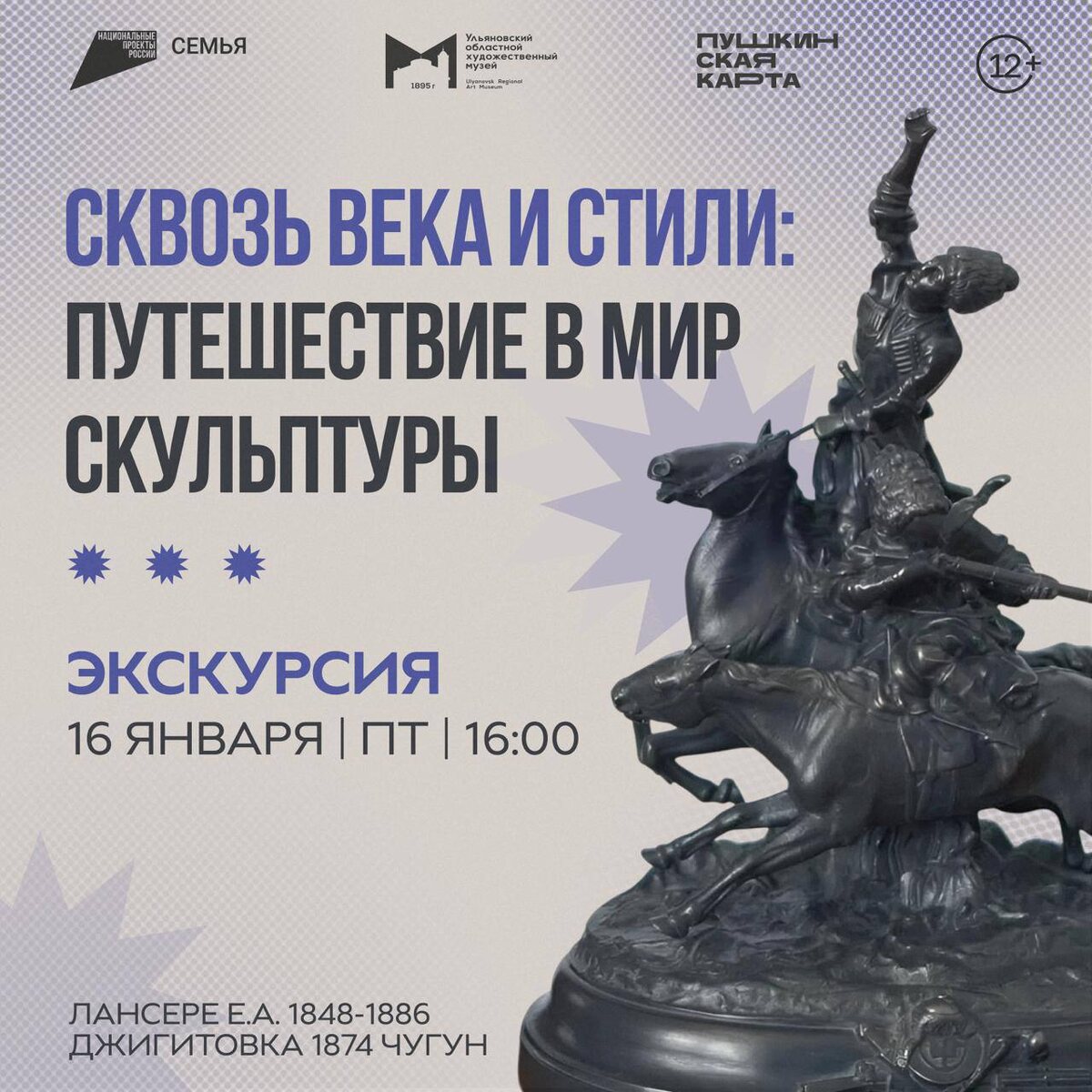 » 🗓️ 16 января, 16:00 📍Ульяновский областной художественный музей Приглашаем увидеть произведения Франсуа Жирардона, Луи-Мари Гишара, Евгения Лансере и других известных и неизвестных скульпторов, представленных в экспозиции Ульяновского областного художественного музея. Вы узнаете, чем станковая скульптура отличается от монументальной, в чем достоинство и своеобразие мрамора и бронзы как материалов скульптора, какова связь скульптурных произведений музейного собрания со скульптурами Петербурга и Версаля. Вы познакомитесь с личными историями героев скульптурных портретов, вспомните античную мифологию и поймете технологию создания скульптурных произведений. Билеты 🎟️ #16января26@culturnik