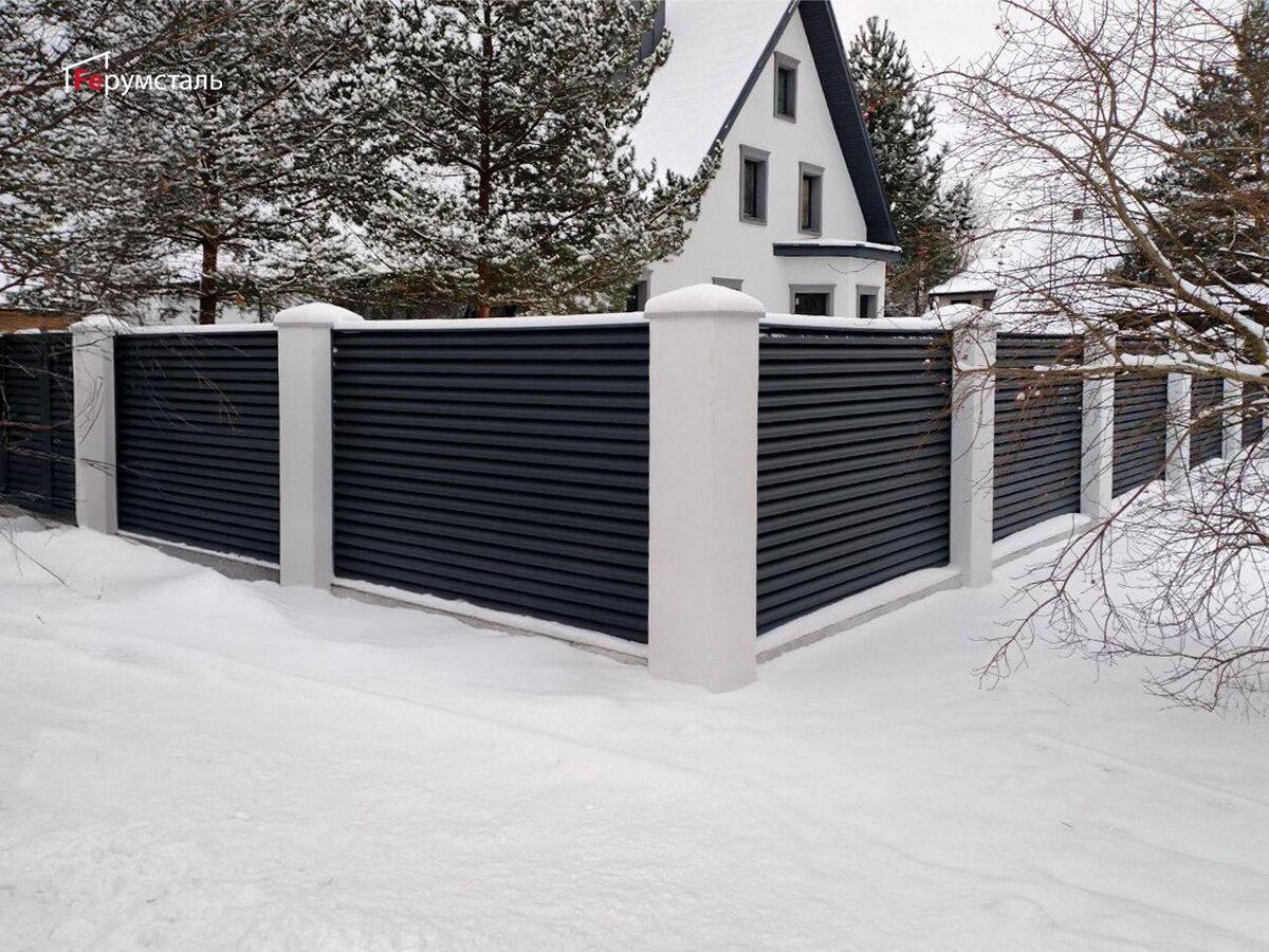 ❄️ ФС Дубль 80 в матовом текстурированном покрытии цвета RAL 7024 «Графитовый серый», создает отличный контраст с белыми опорными столбами