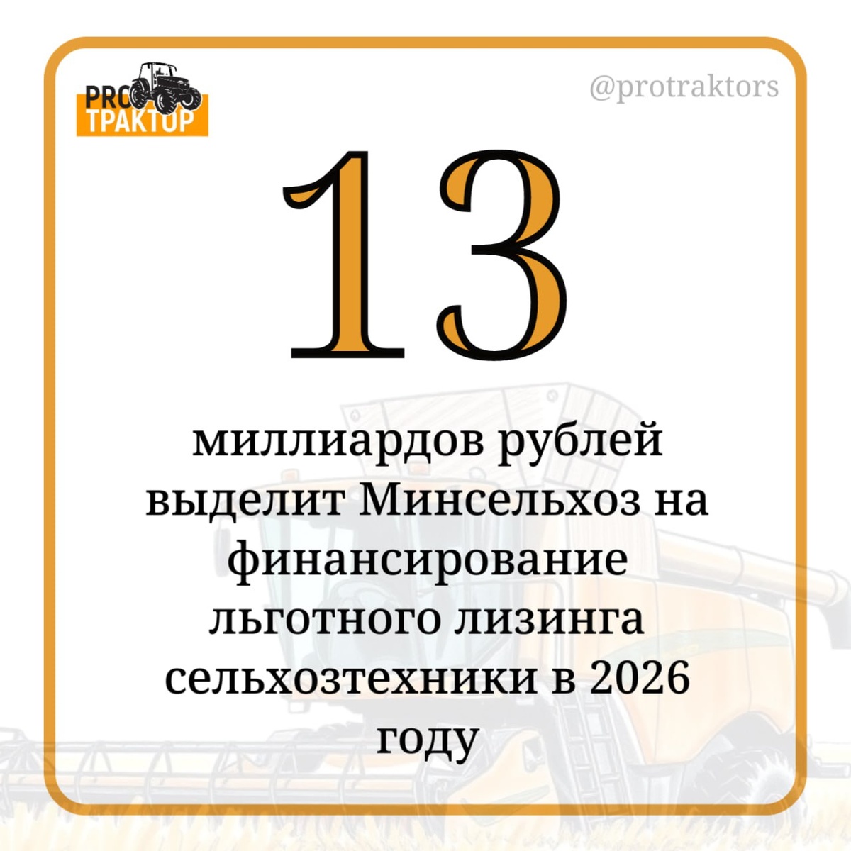 ⚡️ Финансирование механизма льготного лизинга сельхозтехники планируется увеличить до 13 млрд рублей — заявление приводится на сайте