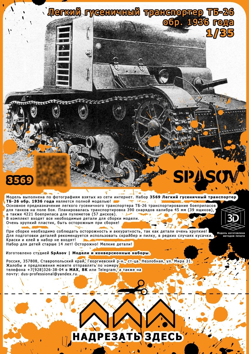 1936 года и саперного танка СТ-26 обр. 1932 года в масштабе 1/35: Легкий гусеничный транспортер ТБ-26 обр. 1936 года (каталожный номер 3569) Легкий саперный гусеничный танк СТ-26 обр. 1932 года с опрокидывающейся системой управления (3558)