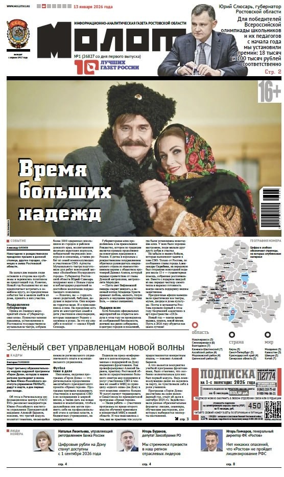 »: 📌Ум, труд и талант В Ростовской области для победителей Всероссийской олимпиады — школьников и их наставников — по распоряжению губернатора Юрия Слюсаря учреждены специальные премии. Ученики получат по 18 тысяч рублей, а педагоги — по 100 тысяч. Подробности — у Ирины Варламовой. 📌Она такая разная, эта пресса Коллегам-журналистам не стоит напоминать, почему именно 13 января Россия отмечает день своих печатных изданий. Но тот факт, что с 1728 года выпуском первой российской газеты, не имевшей постоянного названия, занималась... Академия наук, знают, как представляется, далеко не все. А уж дату рождения подписки — 1 января 1870 года — тем более. Корреспондент «Молота» Вера Волошинова решила напомнить читателям и другие интересные факты, связанные с историей и современной жизнью периодики. 📌Продолжаем зимовать Состояние озимых в донских полях эксперт оценил как «более или менее нормальное». Всходы были дружными благодаря относительно высокой влажности воздуха, даже при том небольш