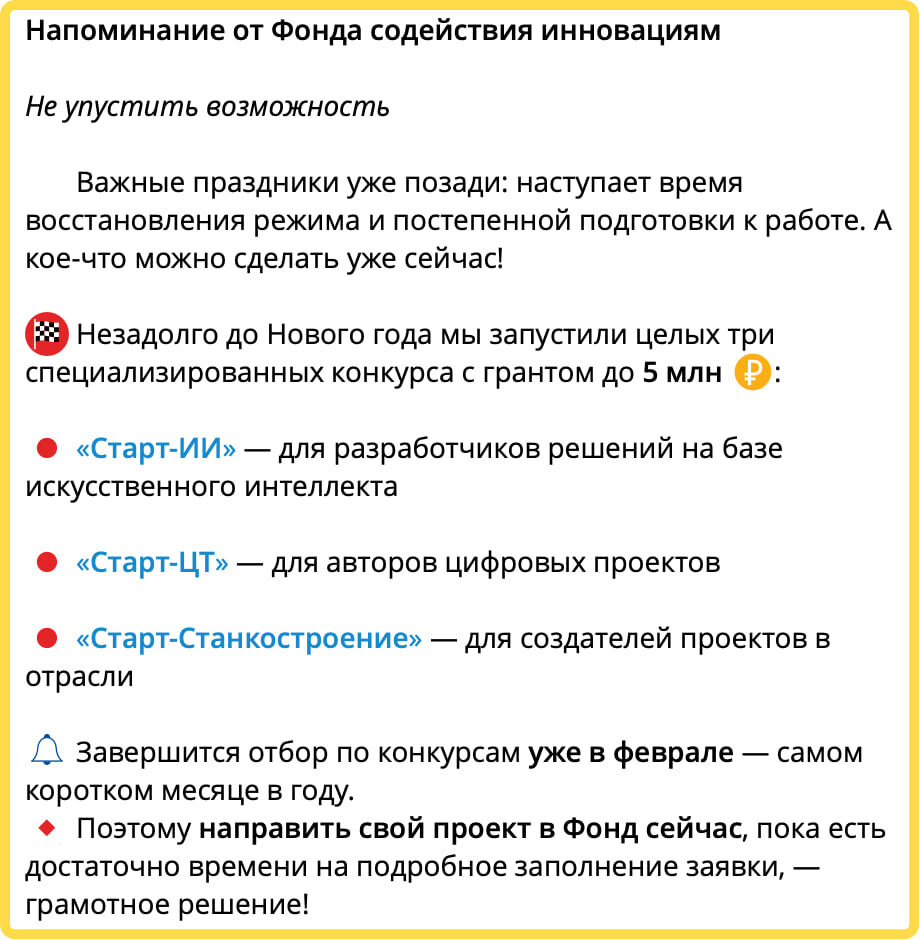 Мы хотим попробовать, но до конца еще не решили, стоит аль нет. Все же любой грант - это довольно много работы, в том числе и бумажной. Дело не только в том, чтобы получить грант, а нужно еще и отчитаться! А отчитываться нужно дважды - через пол года и финально. И отписками не обойтись. P.s совет - продавайтесь на ИИ, ибо это нынче в фокусе фонда. Русский ИТ бизнес