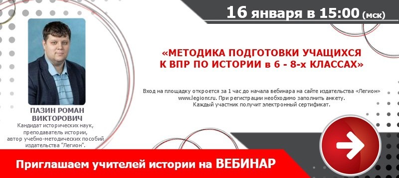 " Дата: 16.01.2026 (Пт) Время: 15:00 Лектор Пазин Роман Викторович - кандидат исторических наук, преподаватель истории, автор учебно-методических пособий по истории и обществознанию издательства "Легион". Участие бесплатное. Выдается сертификат. Требуется регистрация на сайте издательства