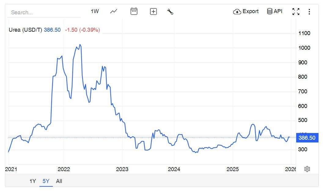 Друзья, помните несколько лет назад кризис в азотных удобрениях? Попался мне на глаза отчет Акрона и сразу вспомнился период 2021 года. Тогда цены на газ взлетели в несколько раз, в след за ними цены на мочевину (газ сырье). Европейские производители стали сокращать производство, что привело к сильному росту цен. А что же сейчас? Предлагаю разобрать сентимент на этом рынке, заодно изучив отчет компании за 9 месяцев 2025 года. 🌾 Итак, выручка компании за отчетный период выросла на 24% до 177,9 млрд рублей, показатель EBITDA на 60% до 71,8 млрд, а чистая прибыль сразу на 82% до 36,7 млрд руб. Результаты впечатляют. При этом идет рост маржинальности по всем показателям, без каких либо бумажных переоценок. Стоит отметить, что у компании большая доля валютной выручки и если бы не укрепление рубля, то Акрон показал бы результаты еще лучше. Конечно, основную роль в улучшении результатов сыграла ценовая конъюнктура. Первые 9 месяцев 2024 были крайне негативными, цены на мочевину достигли дна.